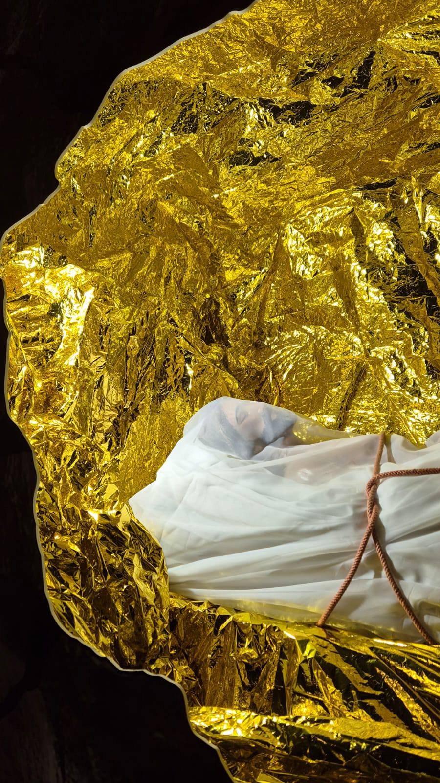 U podstawy dekoracji znajduje się rozłupana forma skalna przypominająca serce, w której złożone jest ciało Chrystusa. Serce to jest jednocześnie grobem — miejscem śmierci, ale także przestrzenią przemiany. Pęknięcie skały symbolizuje moment, w którym śmierć Chrystusa rozbija ludzką twardość i otwiera drogę do nowego życia.